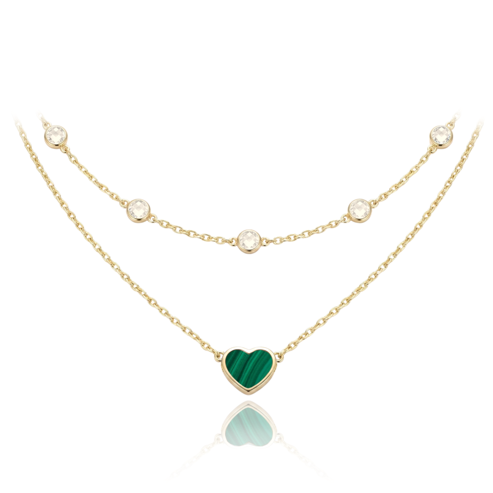 MINET Dvojitý zlatý náhrdelník srdíčko se zeleným malachitem a bílými zirkony Au 585/1000 3,50g