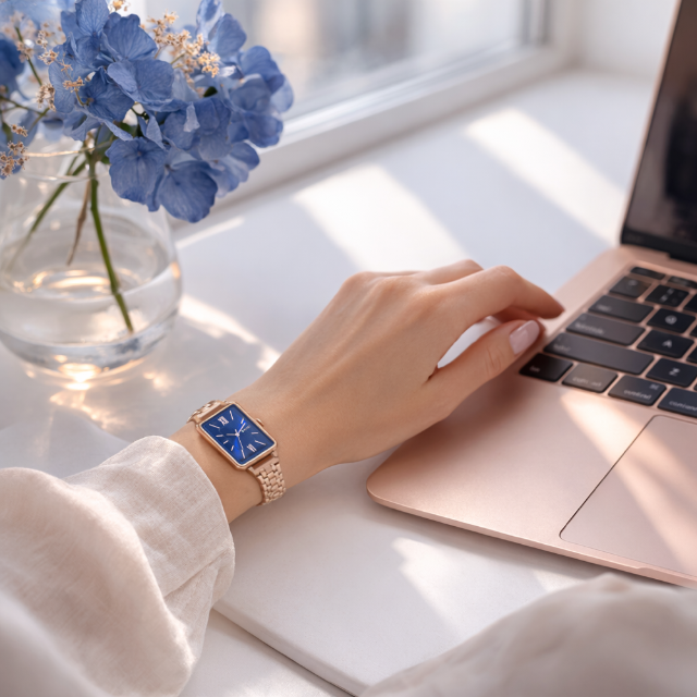 MINET Rosegold-modré dámské hodinky SIENA se rosegold ocelovým řemínkem