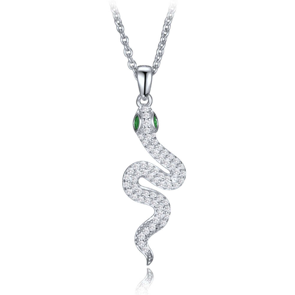Náhrdelník MINET je vyroben z pravého rhodiovaného stříbra Ag 925/1000, které si dlouho udrží svou barvu i lesk. Přívěsek má motiv hada a zdobí ho bílé a zelené zirkony.