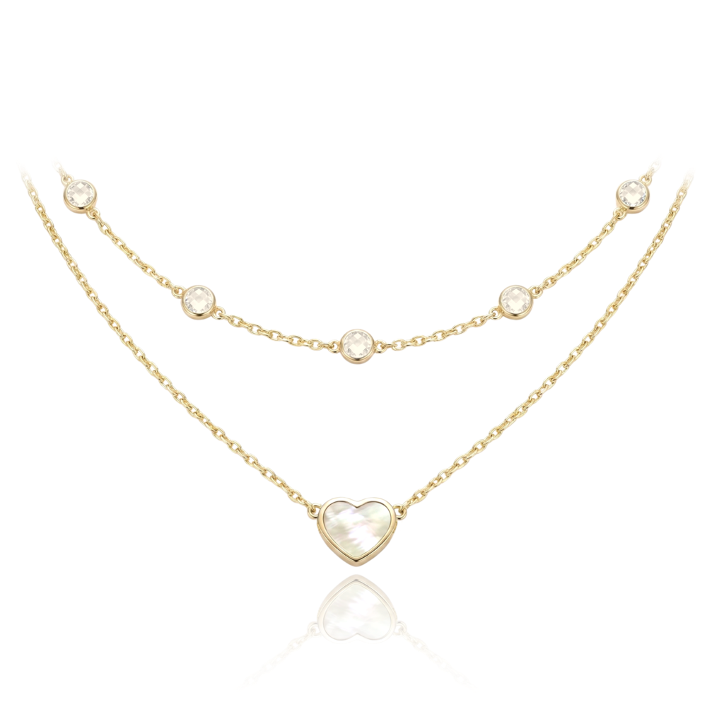 MINET Dvojitý zlatý náhrdelník srdíčko s bílou perletí a bílými zirkony Au 585/1000 3,45g