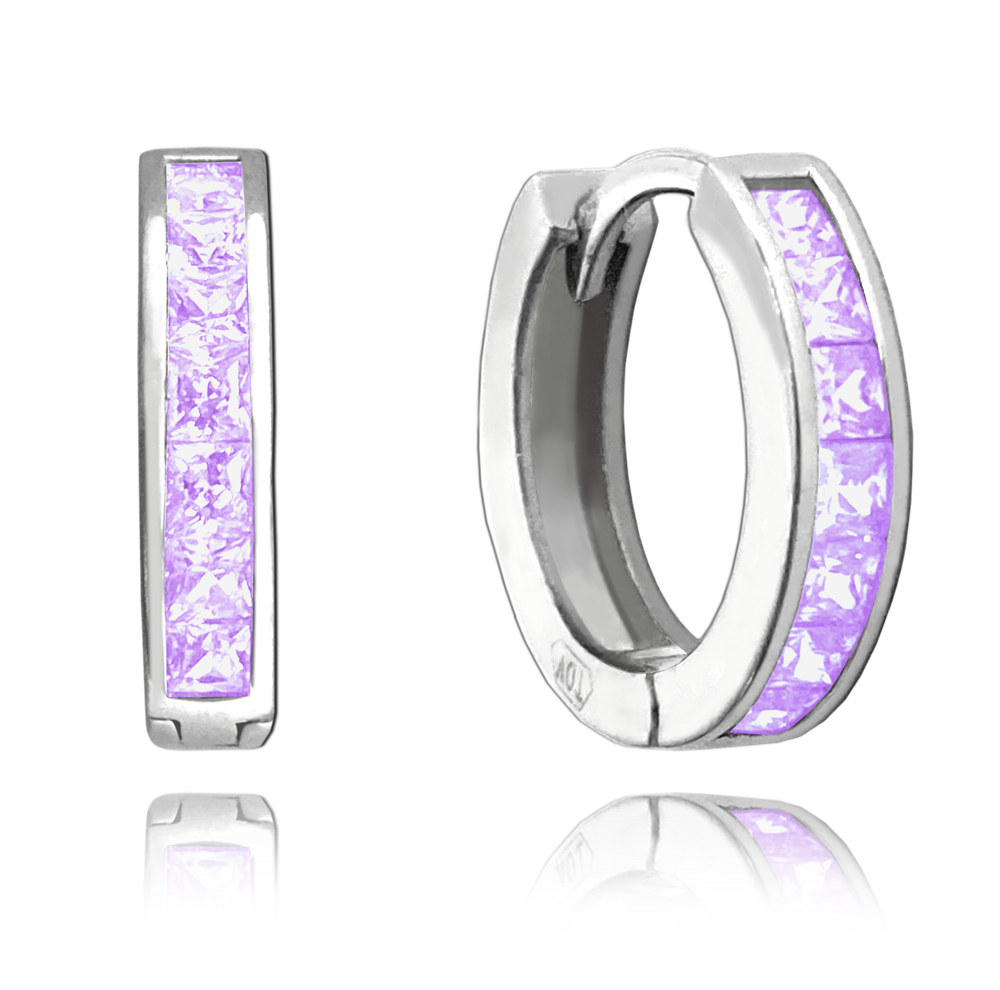 Světle fialové náušnice kroužky jsou díky praktickému zapínání a tvaru pohodlné pro každodenní nošení. Fialové zirkony se krásně třpytí a ozvláštníte jimi svůj outfit. Povrch stříbra je z rhodia, náušnice tedy neztratí svůj zářivý lesk a barvu.