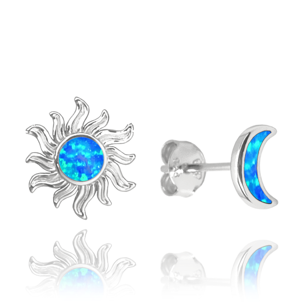 MINET Stříbrné náušnice SLUNCE a MĚSÍC s modrými opály