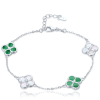 MINET Stříbrný náramek čtyřlístky s bílou perletí a malachitem